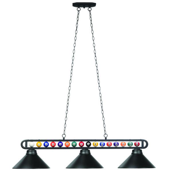 A cheeky tribute to a favorite pastime, this metal billiards light looks fabulous over a pool table or augmenting a home lounge. Delivering excellent lighting, this 3-light fixture boasts an open metal bar frame complete with a line of resin billiard balls. Three metal shades are matte black, delivering classic character and warmth.
