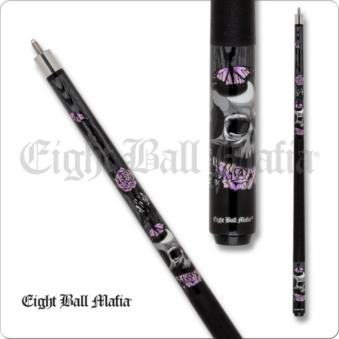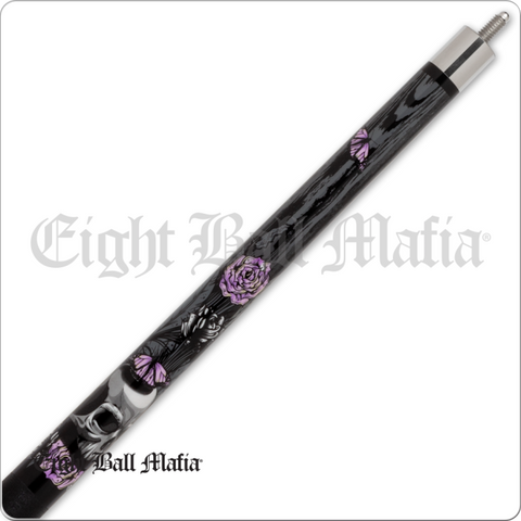 Even roses can be intimidating, as this new Eight Ball Mafia cue shows us. On both the plate and the forearm, the overlays are centered with an intricate design of a skull lying amid several bright purple roses set against a dark black background. No matter how delicate the player, their game may be as fierce as anyone's.