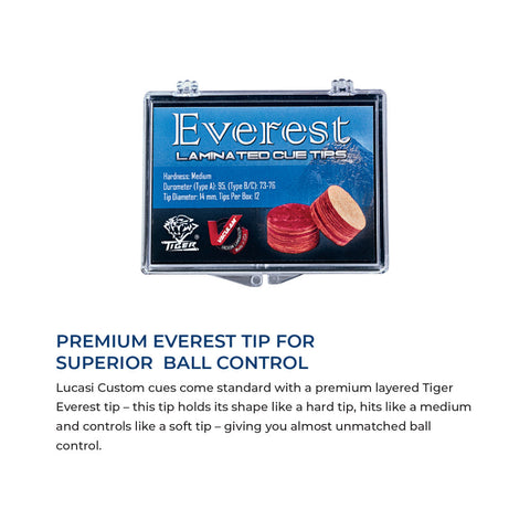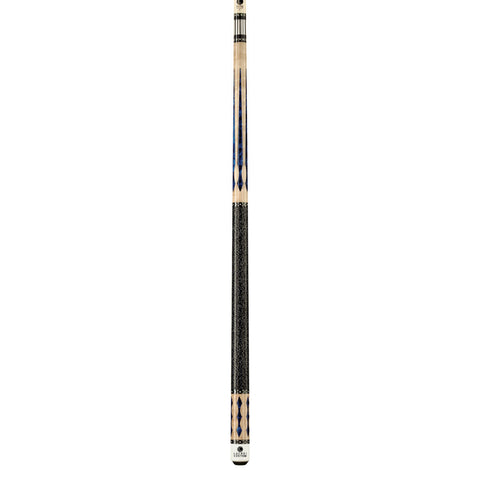 This classic Lucasi Custom cue features a natural Super Birdseye Maple forearm and butt with six-point floating blue luster inlays, black & white double-pressed Irish linen wrap, classic Lucasi rings, white Implex butt cap, quick-release Uni-loc joint, and Zero Flexpoint Solid Core Low Deflection Technology Shaft.