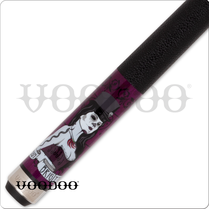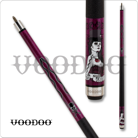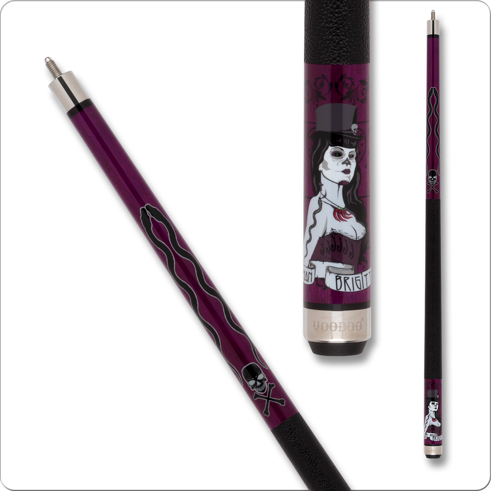 The VOD36 pool cue comes with a deep purple stained forearm and butt sleeve. The image in the butt sleeve is that of the Voodoo Queen herself, Maman Brigitte. All Voodoo cues come stanard with a midnight black leather wraps, hardrock maple shaft and 13mm 7 layered leather tip. The designs for each Voodoo cue are digitally engraved and then coated and stained to match the look of the cue.