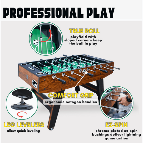 - PROFESSIONAL PLAY- Durable multi-layered “True Roll” playfield provides fast play and precision shooting chrome plated trued steel rods with “EZ SPIN” bushings deliver lightning- fast game action. Comfort grip octagon handles insure comfort and a secure grasp. Counterbalanced players with a crosshatch foot design allows for easy ball control, shooting and passing.