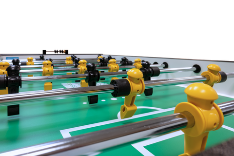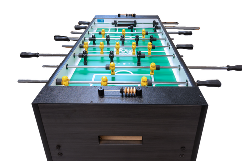 The black and yellow players have an innovative foot design that offers better control for both offensive shots and defensive blocks. This table is equipped with an end ball return and features three goalies.