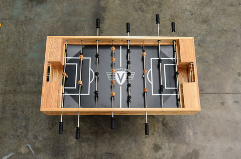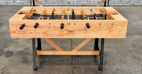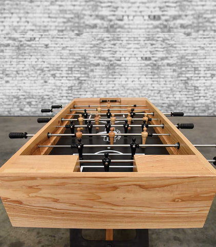 The Astoria Foosball Table carries on the same industrial furniture feel as its complimenting Astoria Shuffleboard Table and is photographed in Ash with a natural clear finish on the cabinet, handles and home men with the away team hand finished in black. The legs on the Astoria are 11 ga. cold rolled steel with a clear powder coat for durability. Custom stains are available upon request. The Astoria foosball table has a ball drop for the start of play and has ramped corners on the playfield for continuous play. It also features solid stainless rods with solid Ash hand turned, wooden players and handles.