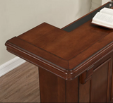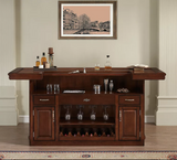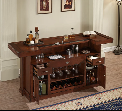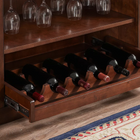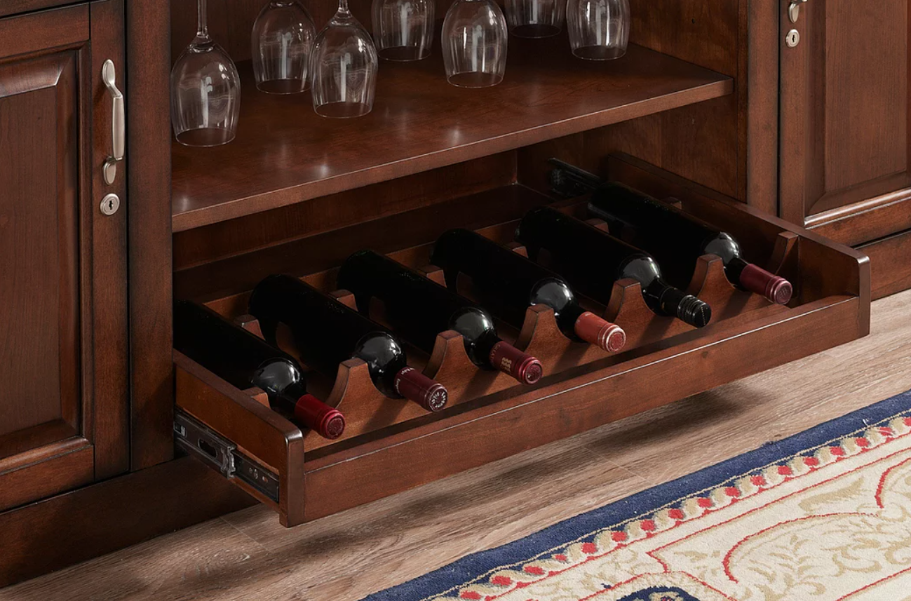 This 88” Bar is finished in Navajo with Brushed Steel accent hardware. It includes a foot pole, ice bucket, glass stemware holders, dual pullout wine bottle storage racks, plenty of storage shelving, locking cabinets and easy-glide storage drawers.