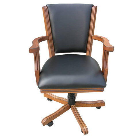 This Kingston Arm Chair with a beautiful honey oak finish is the perfect match to the Kingston Oak Poker Table. These comfortable arm chairs are constructed of durable birch hardwood. Featuring black leatherette, padded bottom and back, and a gas tilt and swivel mechanism, these chairs will provide comfort and class and are easy to keep clean.