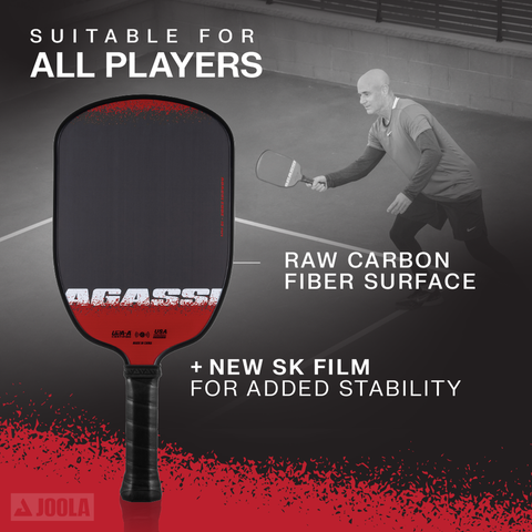 New for the Agassi line this paddle’s honeycomb core is bonded to the carbon fiber surface, giving you the ability to flow between power and a delicate touch. Whether you’re at the kitchen or on the baseline, you’ll hold court all day.