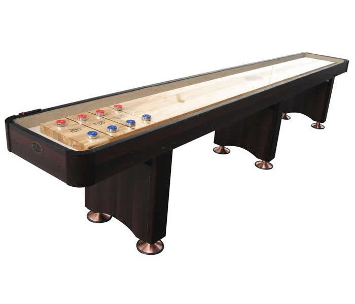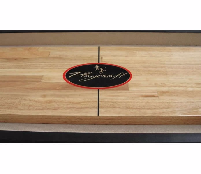 - 1.75" thick, solid maple butcher-block shuffleboard bed, finished with ten coats of lacquer to create a smooth, glossy, fast surface that will last for years