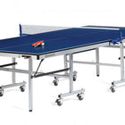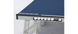 Our mid-range model features a dynamic blue playing surface with matching net and net clips. The 18mm-thick playing field provides great stability and performance while built in compartments grant convenient storage for the included two paddle / 3-ball accessory set. The table features a durable, mobile design with fold-up capability for easy storage. Curbside delivery. Some assembly required.