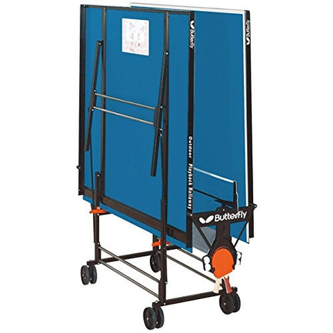 Butterfly Playback Outdoor Blue Table Tennis Table is a durable outdoor table, featuring a SLT (Synthetic Laminate Top) top that sits on a durable frame. This results in a frame that can put up with even more abuse than the Butterfly Outdoor Home Rollaway. This model has the same safety levers on each table half for effective child safety. Net and posts are included and can remain attached to the table in both the playback and storage positions. Legs are indented from sides and ends of table. Available in Blue or Green top.