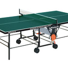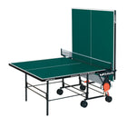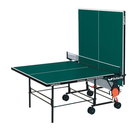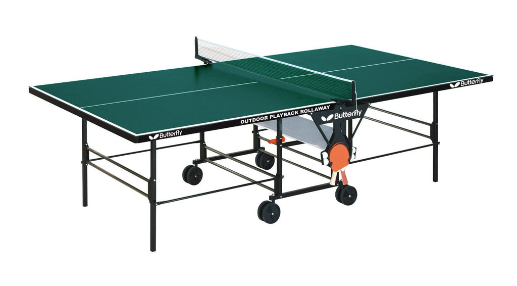 Butterfly Playback Outdoor Green Table Tennis Table is a durable outdoor table, featuring a SLT (Synthetic Laminate Top) top that sits on a durable frame. This results in a frame that can put up with even more abuse than the Butterfly Outdoor Home Rollaway. This model has the same safety levers on each table half for effective child safety. Net and posts are included and can remain attached to the table in both the playback and storage positions. Legs are indented from sides and ends of table. Available in Green or Blue top.