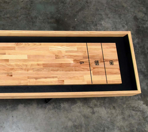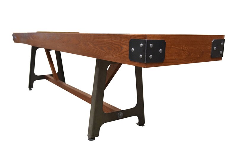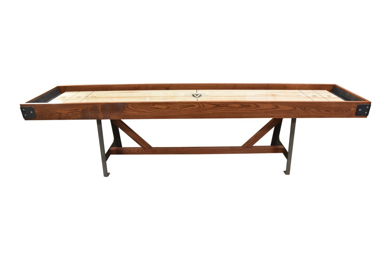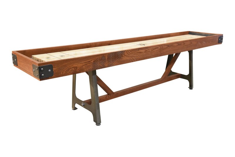 In the white hot industrial furniture market, the Astoria Sport Shuffleboard Table fits right in as the refined industrial solution for any area both residential or commercial. The metal legs are made to Venture’s exact specifications using 11 ga. cold rolled steel and are sprayed with a clear powder coat for durability. The hand rubbed stain accents the hardwood to enhance the natural beauty. The Astoria shown is photographed in the 12’ sport size in Natural Stain with leather gutters.