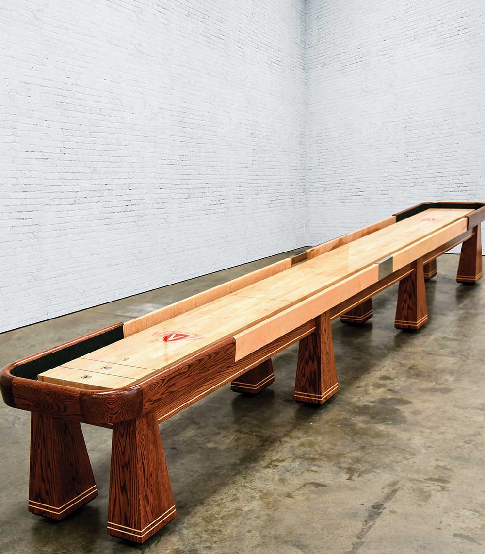 - 3″ thick X 20″ wide pro playing surface, coated with Venture Shuffleboard’s exclusive hard clear synthetic lacquer