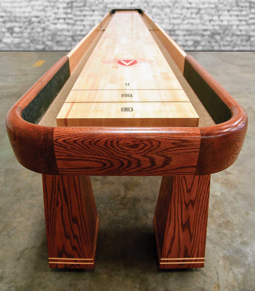 The Saratoga Shuffleboard Table features custom, solid Red Oak, tear drop horse collars, and 6/4 side rails with custom made Adirondack style legs that come together to create a masculine, rugged shuffleboard table. The horse collars are upholstered with rich toned leather to complement each wood stain. The Saratoga is photographed in Chestnut Stain on Red Oak wood with Curly Maple side rails.