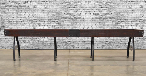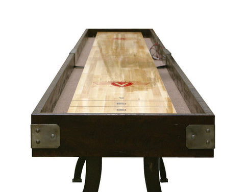 The Williamsburg Shuffleboard Table is Venture’s tribute to the men and women of the Industrial Revolution, who helped mold this country into a model for the world to emulate. The Williamsburg Shuffleboard captures the essence of that age with solid 6/4 hardwood rails, hand rubbed stain, leather gutters, corner brackets and center connectors custom made for this table, and legs that are fabricated out of solid 11 ga. steel. The Williamsburg Shuffleboard is photographed in the standard Bennett Stain.