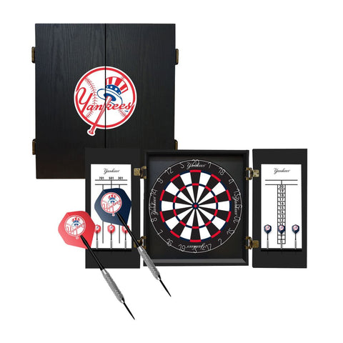The Fan's Choice New York Yankees Bristle Dartboard Cabinet features your favorite team logo and includes a premium 18-inch tournament sized self healing bristle dartboard. Self healing bristle dartboards are some of the longest lasting boards on the market since the holes close up after each dart is removed. This hanging dartboard cabinet will look great in your fan cave or any room that your family and friends gather. It's easy to assemble; the cabinet comes preassembled and ready to hang on the wall. Secure the dartboard and you are ready to have hours of enjoyment!