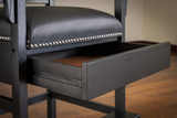 Crafted to reflect its name, keep your eyes on the action with this stately viewing chair. The King Chair touts a wide and slatted back, armrests complete with cup-holders and notches for billiard cues, and a hidden drawer for storage.