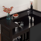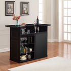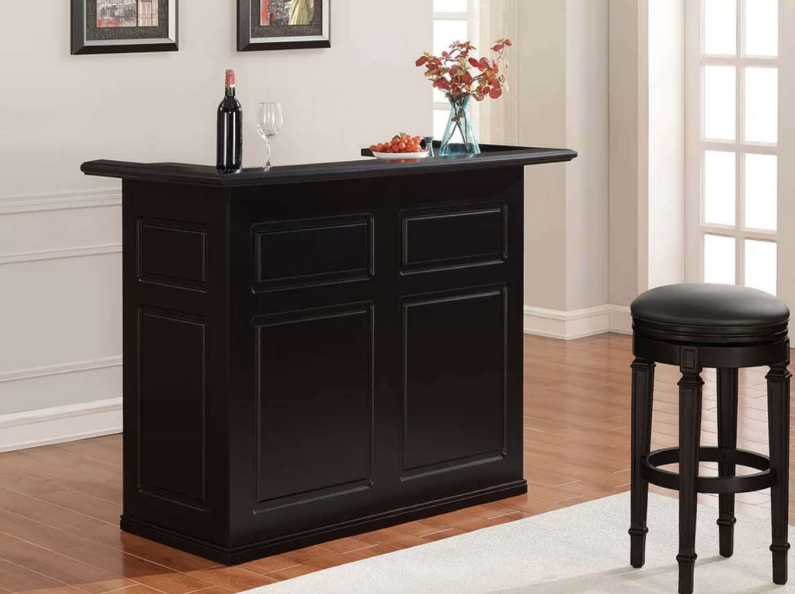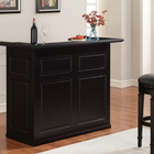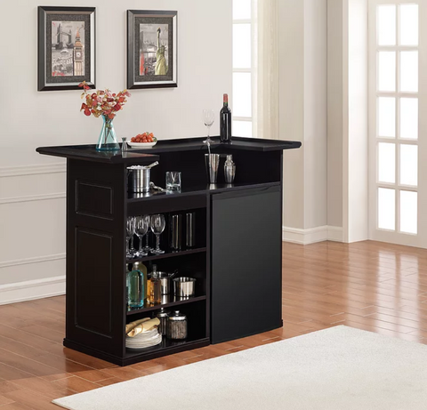 The Trenton Bar is finished in Black with decorative front panels, open space for a fridge and storage shelving.