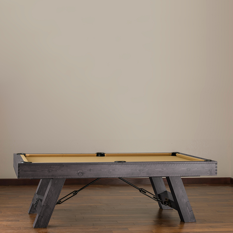 The American Heritage Savannah pool table features a rustic charcoal finish combined with black, worn industrial hardware that makes the pool table a special addition to any room. The decorative steel turnbuckle element only adds to the unique style of this heirloom. The American Heritage Savannah pool table offers excellent playability while its’ astonishing design, exceptional tailoring and Charcoal finish projects panache and sophistication.