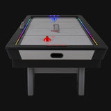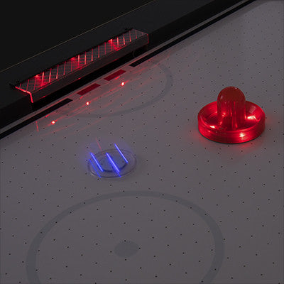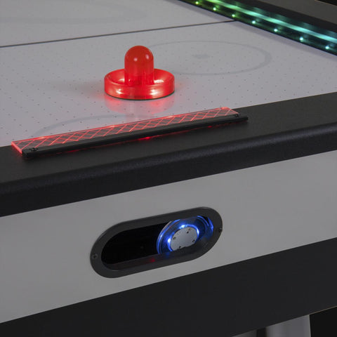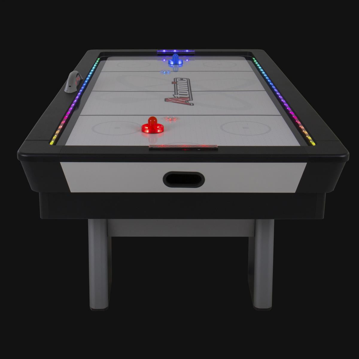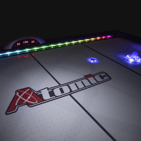 Enjoy the action-packed fun of the arcade in your own home with the Atomic Top Shelf Air Hockey Table. This classic arcade-style air hockey table features a 120V motor for maximum air flow creating consistent puck action. The slick 82" L x 41" W play surface is constructed out of PVC laminated MDF for high-speed play. Play in the dark as the LED Lumen-X technology illuminates the table with red, green, and blue multicolor light effects while listening to high-tempo music for added intensity.