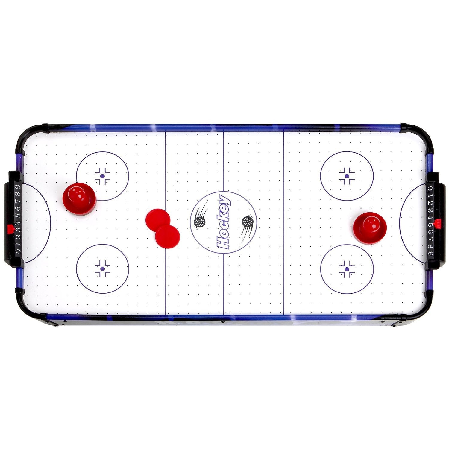 Experience the thrill of air hockey wherever you go! The Hathaway Blue Line Portable 32" Air Hockey Table is a space saver, lightweight, extremely durable, and features built in goal boxes and slide scorers. The powerful blower provides awesome, fast-paced table action. The table comes complete with two 2.5" strikers and two 2" pucks. 180-Day Limited warranty.