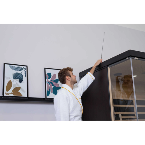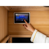 Unlike any other sauna on the market today, the Sirona Premium Sauna features a sleek and contemporary design with unprecedented, innovative technology. The engineered-wood exterior panels laminated to "A" Grade, reforested Western Canadian hemlock provide maximum inner cabin heat-retention; while the stylish cabin design features an easy-clasp assembly system, safety glass, heavy-duty door hinges, commercial-grade heating panels, state-of-the-art touch screen control pad, high-performance speakers, interior lighting, chromotherapy and ceiling accent lighting. The handsome, rich mahogany melamine exterior panels accented in black add the final touches to this ultra-modern design that is certain to be an elegant addition to any interior space.