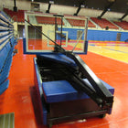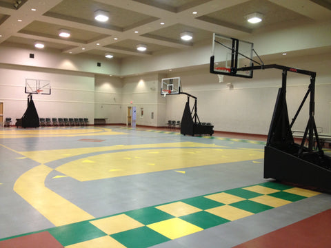 The distance from the backboard to the base of the unit is variable from 54" to 66" allowing the Storm to fit in your facility. Heavy foam padding, available in an array of colors, protects players on the front, sides, and back of the base. The unit is extremely stable as well as durable, and will not tip over when players hang on the rim.