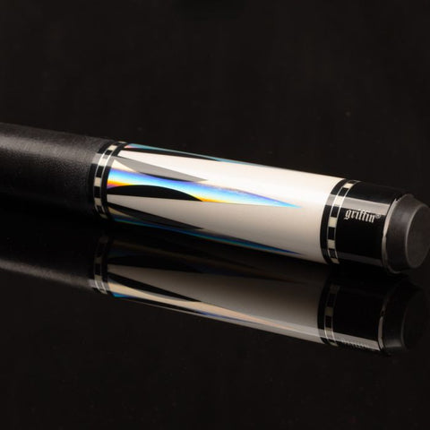 Griffin pool cues are designed and built for tournament-level performance at a price that won't break the bank! The GR63 has an icy pearl white forearm and sleeve, with black and iridescent foil points that look AMAZING under a pool table light! Griffin cues come with a 13mm North American maple shaft and a Tiger Everest tip for reliable performance.