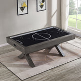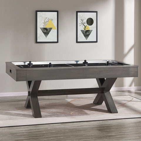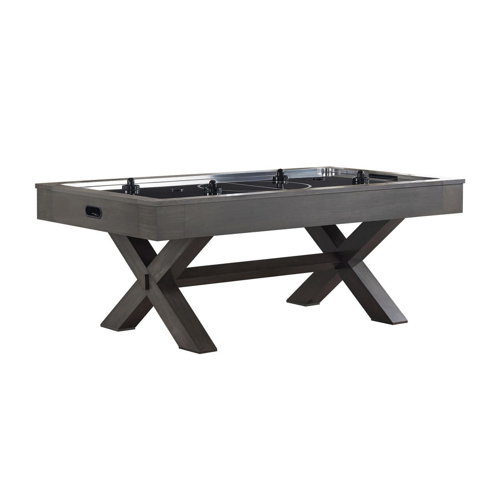 Score major points with the Blake Air Hockey Table. This sleek table boasts a seriously impressive silhouette with X-shaped legs with a modern style that elevates the look of any room. It has a single, powerful fan for smooth, even airflow that keeps up with even your most competitive gameplay. The regulation size field plays fierce and looks sharp in a rec room. Two manual, inset scoring systems allow the table to accommodate a table tennis conversion top so you can play two games on one table. It comes with 4 pucks and 4 goalies so you can dive right into the excitement.