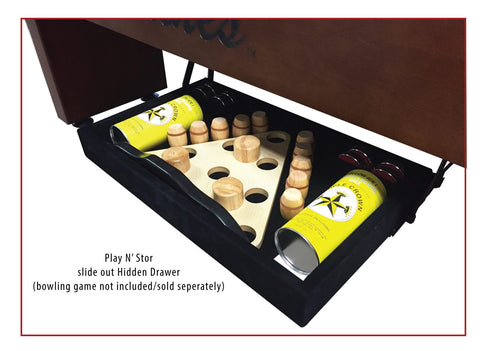 Holland Gameroom is proud to offer this professional quality, Officially Licensed Shuffleboard table. The American Shuffleboard table is constructed from solid hardwood. The cabinet, which comes in Chardonnay or Navajo finish, features beautiful, laser engraved logo art elements. The cabinet finish is second to none and incorporates a 14-step stain and lacquer process to ensure the high quality, furniture like finish you would expect from a table of this caliber. The 16” wide, 2 ½” thick play surface, is topped with a ¼” thick, poured polymer resin top, that offers extreme durability and exceptional play. On the underside, 5 climatic adjusters allow for consistent play year-round. The cradle is supported by heavy gauge steel support brackets that lock the two halves securely in place. The commercial grade legs include leveling feet so even if your floor isn’t level your shuffleboard table will be. For scoring, the table has two metal, not cheap plastic like most, abacus scoring units, one on each side, or you can purchase the optional electronic overhead scoring unit to really up your game! Finally, the pre-installed Play N’ Stor Hidden Drawer folds up under the game, keeping your pucks, Cleaner, Polish, and Wax stored conveniently and out of the way. There is even room for the optional bowling game. If you are in the market for a high quality, Officially Licensed Logo Shuffleboard Table, look no further than this one from Holland Gameroom!
