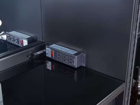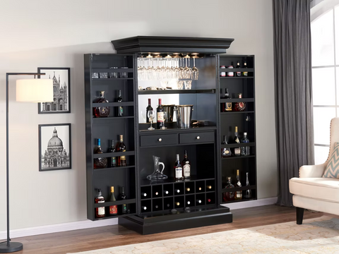 A striking statement in any room, the Ashton Bar Cabinet delivers on style with brushed steel hardware and automatic ambient lighting that reveals the functional and feature-loaded interior. Elevate your home with this stylish piece of bar furniture, featuring an easy to clean, removable black glass workstation and gridded wine rack to house your favorite vintages, this gem also feature a handy electrical outlet for small appliances or phone charging and plenty of storage space in the doors for your accessories and preferred stock.