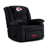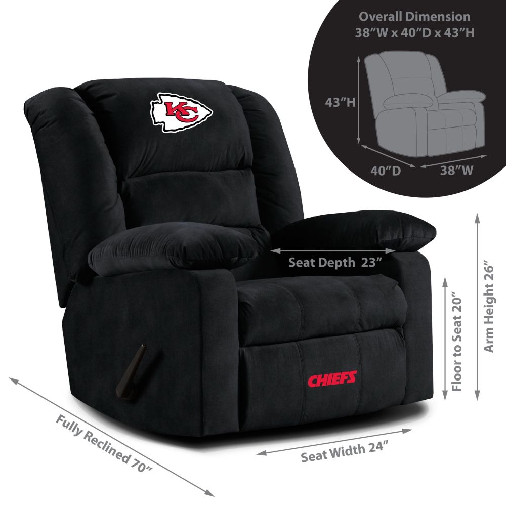 Relax and watch the game in complete comfort with the Kansas City Chiefs playoff recliner. Bring home-field advantage to any room of the house with durable, vibrant microfiber fabric and direct embroidered logos on the head and footrests. A kiln-dried hardwood and cross-banded plywood frame make this chair as sturdy as it is comfortable. Product is officially licensed by the NFL and is made in the USA.