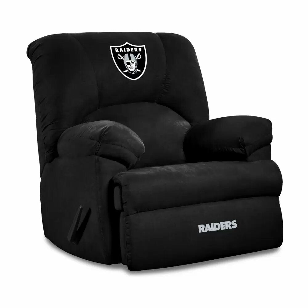 Watch the Big Game in complete comfort with the Las Vegas Raiders GM Recliner. Bring home-field advantage to any room of the house with durable, vibrant microfiber fabric decked out with an embroidered logo on the headrest and ottoman. Enjoy this rocker recliner, fit for the fan up to 6 feet tall. Kiln-dried hardwood and cross-banded plywood frame make this chair as sturdy as it is comfortable. The product is officially licensed by the NFL and is made in the USA.