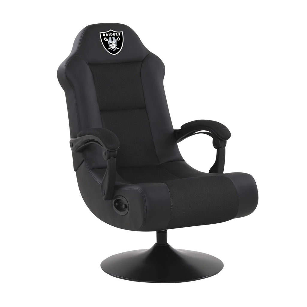 Take your game playing experience to the next level with this NFL Ultra Gaming Chair. Designed as the ultimate fan seat, this chair has an all-wood frame, built-in Bluetooth capability and a round metal base with a swivel function. An advanced addition to any game room or fan cave, this chair features four internal speakers and side control panels with volume and base controls, input/output jacks and a headphone port. Black PU leather and mesh give the chair a sleek and stylish look while the ergonomic high-density foam seat and chair back provide great back support. Product is officially licensed.
