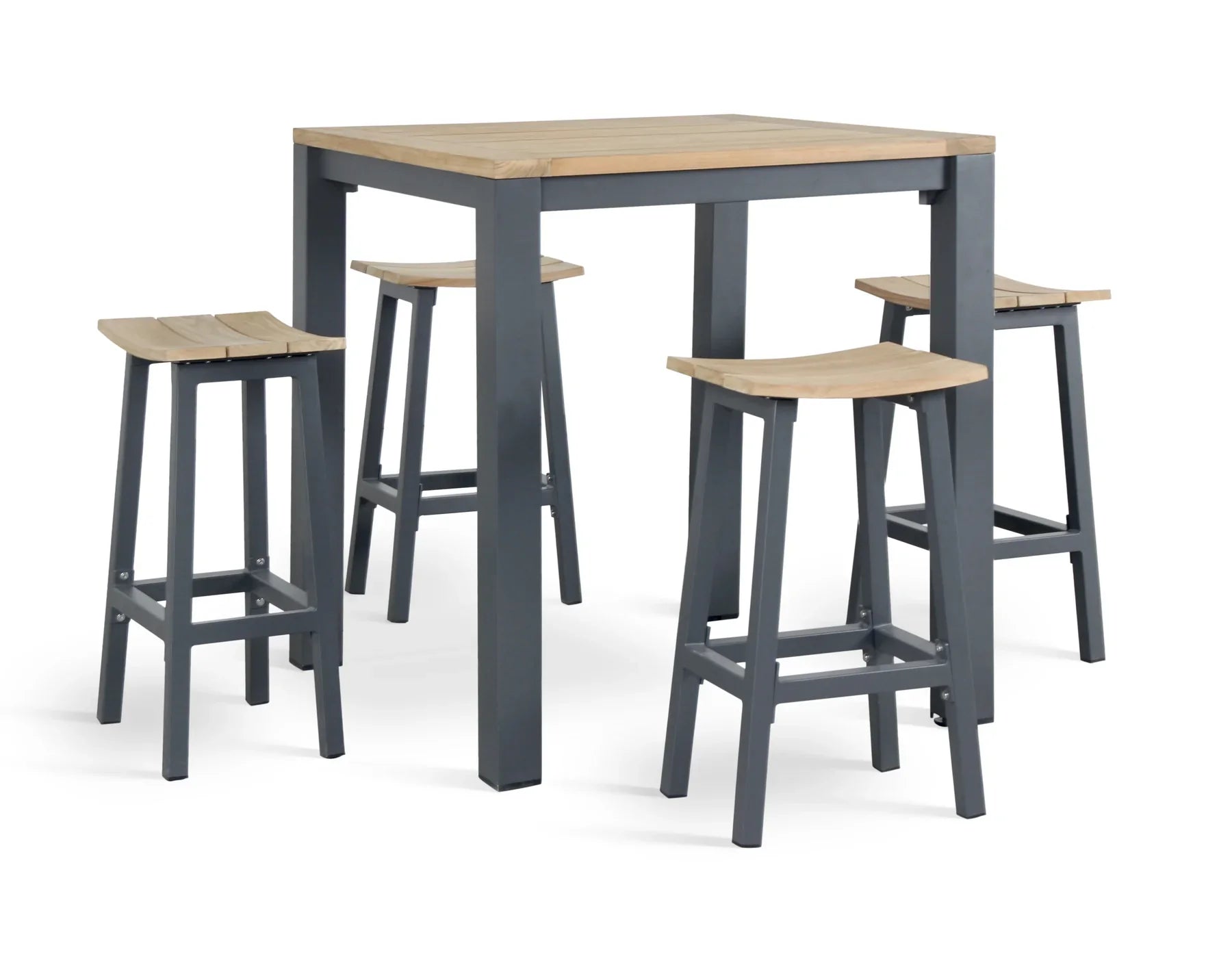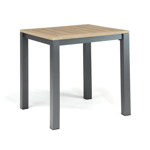 The teak wood table top with slat top style gives a modern rustic design. The aluminum frame is rustproof and weatherproof. The charcoal color compliments the wood on the tabletop. Combine other Elba Collection pieces to create an inviting outdoor experience to enjoy with family and friends.
