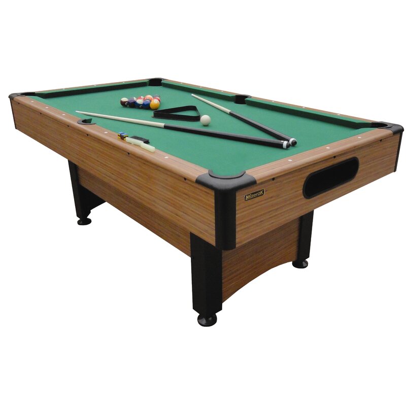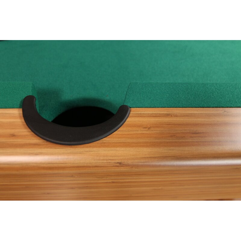 Billiard tables can range anywhere from 7-10 feet long, which can easily overwhelm a rec room. However, the Mizerak Dynasty gives you all the fun of traditional billiards in a table that is only 6.5 feet long. Disc-style leg levelers allow you to adjust the height of each corner of the table for a perfectly level playing surface even when the floor is sloped. Rubber cushions around the perimeter of the play-bed offer excellent rebound for speed and accuracy. Rail integrated pockets lead balls to the end of the table for a ball return system that makes resetting for another game quick and easy. The green nylon cloth is a durable material that will last through years of aggressive family play and gives the Dynasty a classic billiard look. The Dynasty features a stylish bamboo laminate exterior that compliments almost any decor. The 5.5 inch rails offer solid resistance for consistent rebound. Cross supports between the table legs increase the rigidity of the table to prevent wobbling. The Dynasty features a double sealed MDF play-bed that provides a consistent roll and resists warping. Black corner posts and caps compliment the bamboo laminate creating a sleek, classic design. The Dynasty comes with a classic set of billiard balls including a cue ball. A black, plastic triangle, 2 pieces of blue cue chalk and a brush for the table cloth are also included. To complete the game, the Dynasty comes with two Mizerak cues.