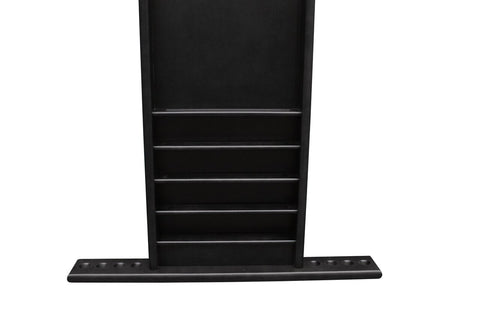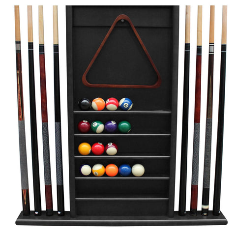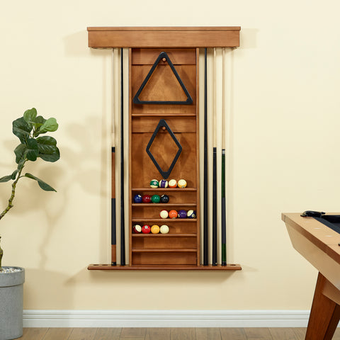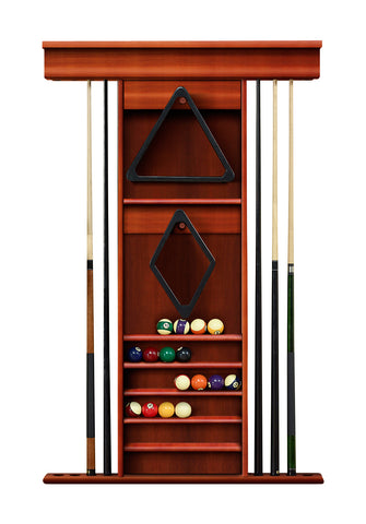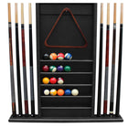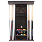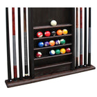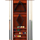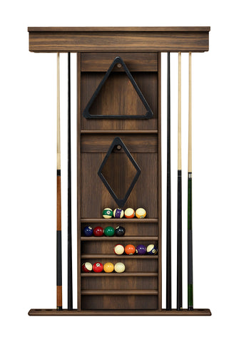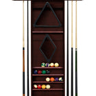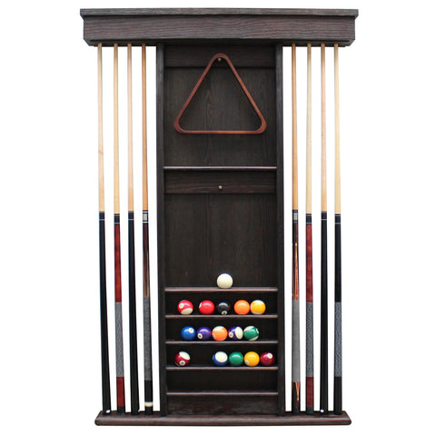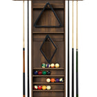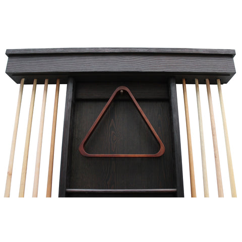 Hardwood billiard equipment wall racks match the Playcraft Fairfield Collection pool tables, available in Weathered Black, Weathered Brown, Weathered Barn, Chestnut, Espresso, and Black