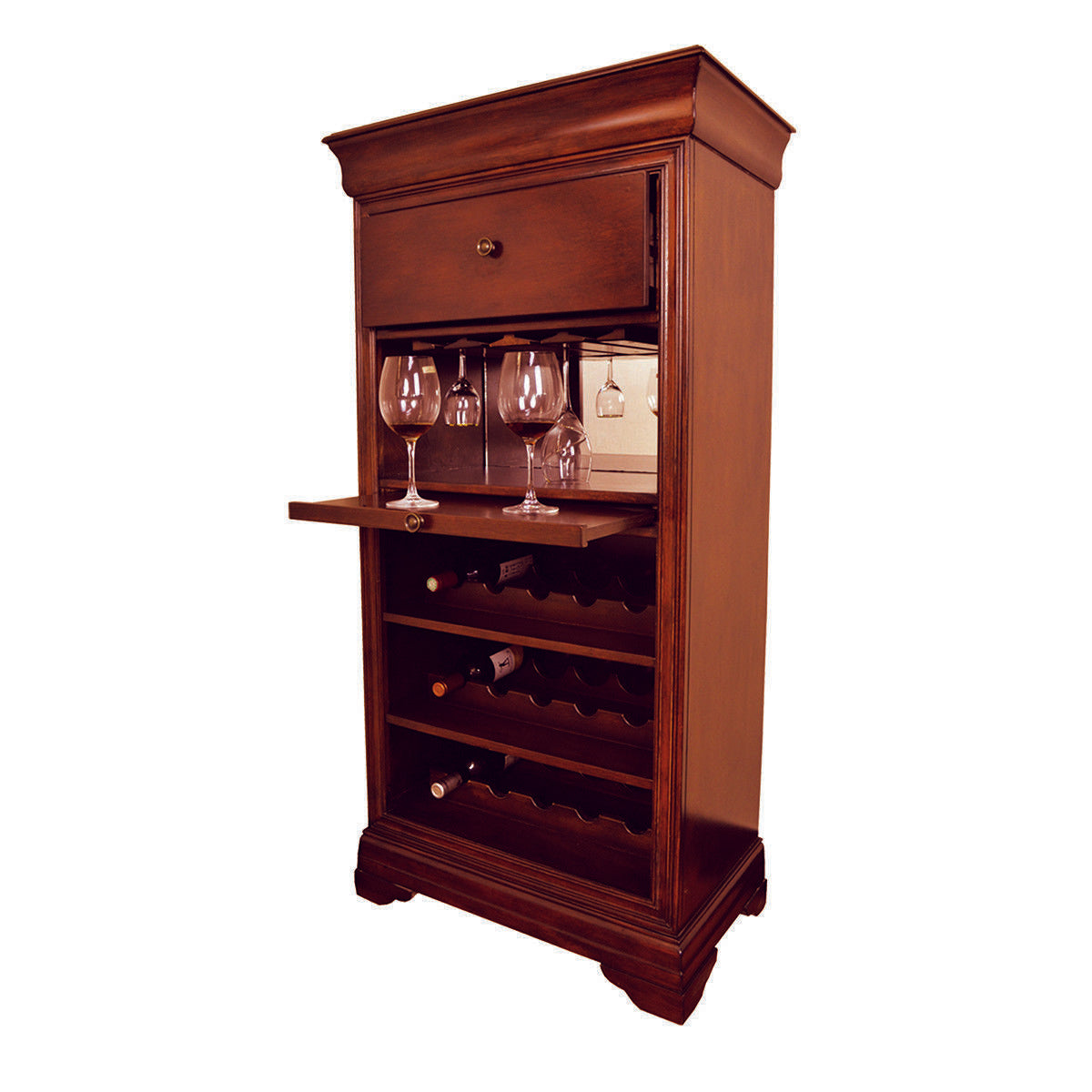 A delightful addition with subtle presence, this english tudor bar cabinet includes a spacious wine bottle rack, one drawer, and a pull-out tray perfect for pouring.