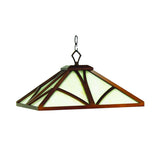 Wood framing creates an arrow-inspired detail to complement each side of the square stained glass shade on this Chateau pendant light with a chestnutfinish.