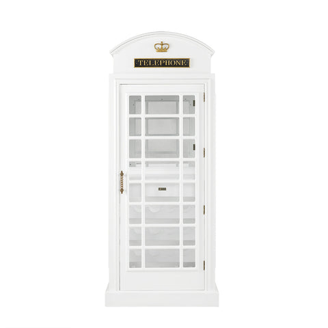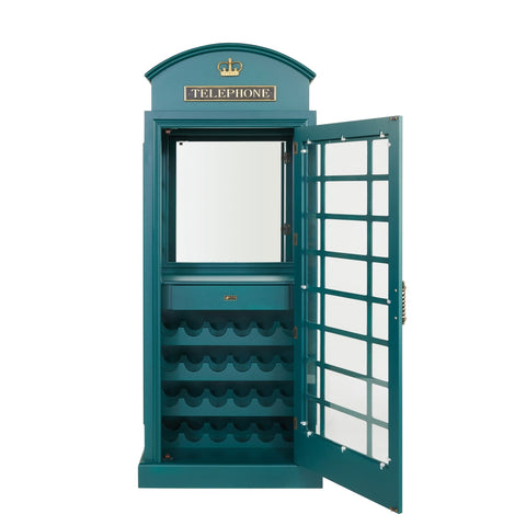 This classic English phone booth bar cabinet brings a touch of vintage charm and sophistication to any space. The upper compartment features a mirror, adding a timeless bar aesthetic that enhances the overall look. Equipped with a convenient storage drawer and a built-in wine rack, it offers ample space for organizing your bar essentials. The cabinet is also complete with internal lighting, creating an inviting ambiance that beautifully showcases your collection and makes entertaining even more stylish.