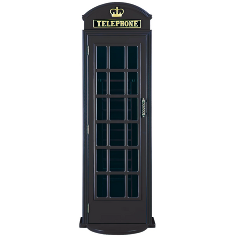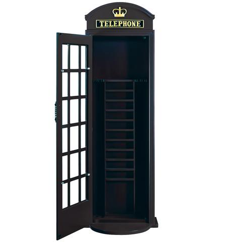 Store your cues in this one of a kind traditional English phone booth cue holder. Plenty of space for ball sets, chalk, table accessories and more. This unique game room piece looks great and will be a certain conversation starter. 6 cue slots and storage reside behind a glass door.