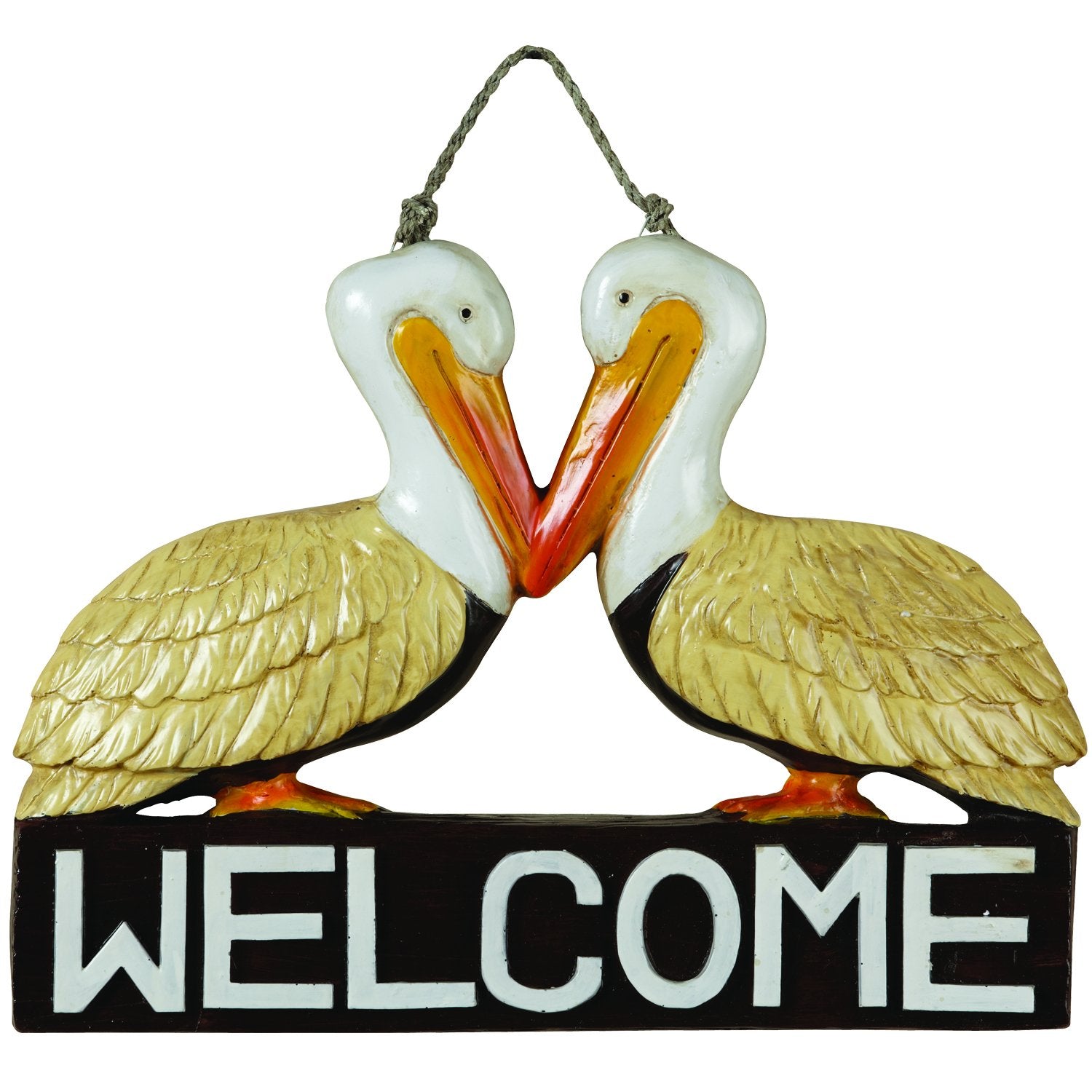 Make guests feel right at home at a patio or poolside lounge with this colorful hand-painted, pelican-themed outdoor wall art welcome sign.